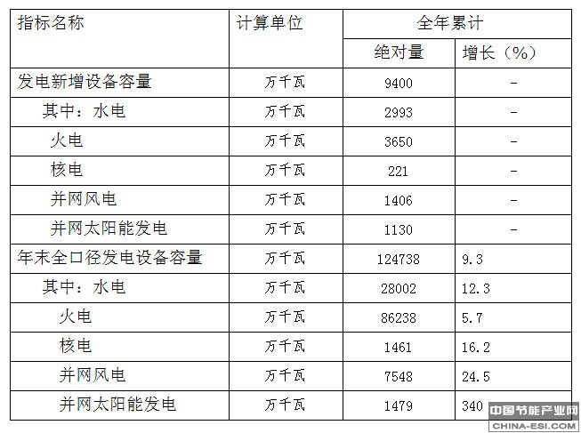 根据中电联快报统计,2013年全国发电装机实现平稳较快发展,全年新增发电装机9400万千瓦,其中,水电新增2993万千瓦,火电3650万千瓦,核电221万千瓦,并网风电1406万千瓦,并网太阳能发电1130万千瓦。